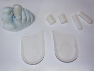 Unsere Gelenke halten der Beanspruchung nur dann über längere Zeit stand, wenn die Bewegungen aktiv gesteuert und kontrolliert werden. Das geschieht im Zusammenspiel von Skelettmuskulatur und Nervensystem (Propriozeption = Stellungs-, Kraft- und Bewegungssinn). Der Ausfall von Propriozeptoren, führt zur Einschränkung der Bewegungswahrnehmung und nachfolgend auch zu einer unzureichenden muskulären Gelenksicherung und –führung. Orthosen beeinflussen die Propriozeption durch Einwirkung auf oberflächlich gelegene Propriozeptoren und durch Stimulation von Rezeptoren in der Haut. Dies wird durch eine individuelle Anfertigung in Silikon-Technik unter Berücksichtigung der Biodynamik des Fußes erreicht. Orthosen können druckentlastend oder korrigierend wirken. Die Optik und Funktion von Orthosen sind so individuell wie die zu versorgende Fehlstellungen! Es handelt sich um Maßanfertigungen am Fuß. Orthosen haben sich als ein so gutes Hilfsmittel eingeführt, dass unsere Arbeit ohne sie kaum noch denkbar ist. Bei der Anfertigung von Orthosen haben wir verschiedene Zielrichtungen: – Befreiung von Fußbeschwerden – durch Formen eines individuellen, dauerhaften, genau passenden elastischen Reibungs- oder Druckschutzes, welcher sich als Polster um, vor oder hinter die Problemstelle legt und die Beschwerden lindert oder ganz wegnimmt – Ruhigstellung von Druckstellen bei Entzündungen – Gewebe, Gelenke als auch Nagelpartien – Korrektur von Fehlstellungen einzelner Gelenke und Zehen Die Möglichkeiten der Anwendung erstrecken sich auf nahezu alle Bereiche des Fußes. Hallux Valgus, Hühneraugen, besonders zwischen den Zehen, genauso wie Druckstellen bei Spreizfuß-Problemen. Hammer – und Krallenzehen können genauso versorgt werden, wie Teile des Hohlfußes oder ein zu stark belasteter Senkfuß. Was ist zu beachten? – Die Orthosen werden am Fuß anmodelliert und individuell angepasst – Nach dem Anfertigen der Orthose erfolgt eine Nachkontrolle – Die Orthose wird jeden Tag getragen und nachts entfernt – Die Orthose braucht genug Platz im Schuh. Für Sie ändert sich nach der Anfertigung der Orthose im alltäglichen Ablauf nicht viel. Eine Orthose kann ohne Probleme im späteren Verlauf individuell neu angepasst werden.